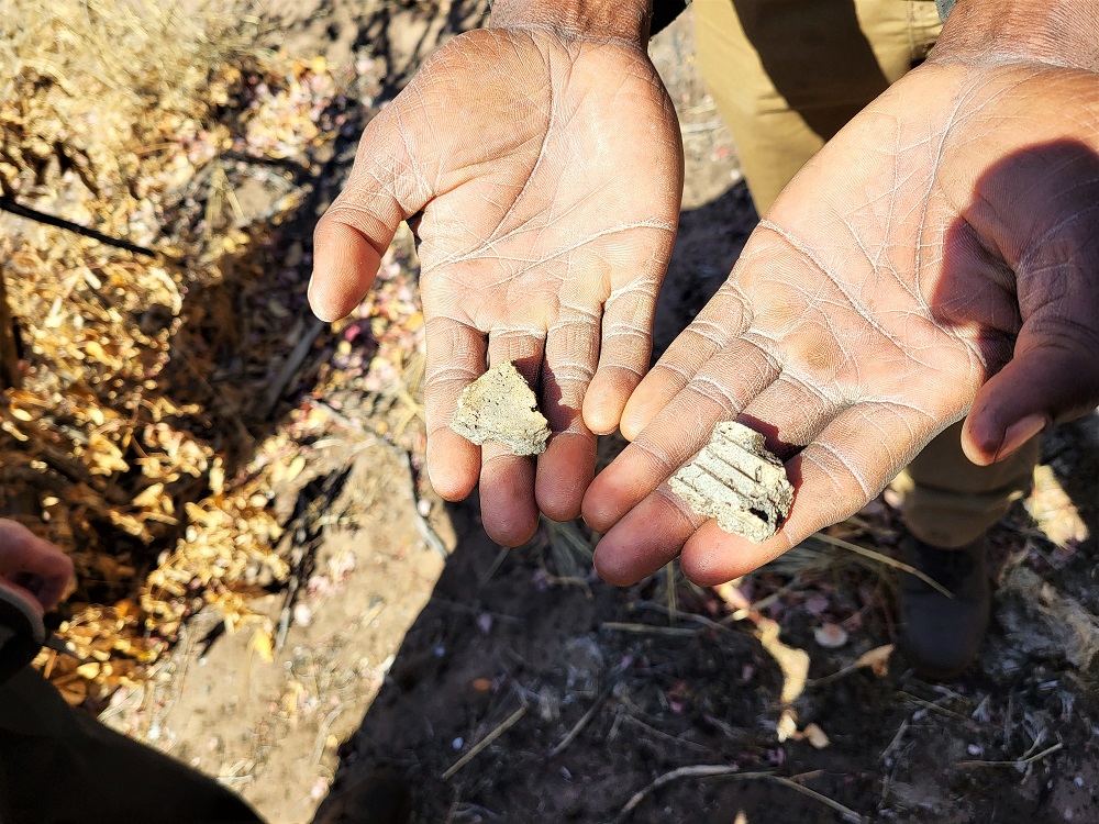 Morango showed us how to identify hyena poo, too, (above, it’s often white because the scavengers eat a lot of bones), as well as a few pieces of pottery he found in the dusty ground (below).