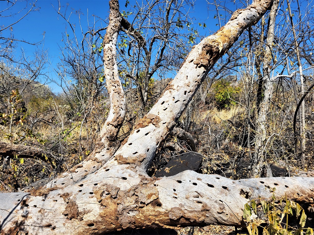 We also passed some unusual tree species, including a number of baobabs and a mongongo tree (above), which is beloved by elephants for its nuts.