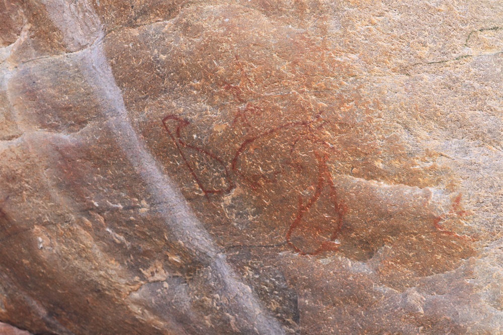 The top of the hill was flat and we were delighted to find yet more rock art, including one painting that featured three human figures (below), which the San people used to initiate their hunters.